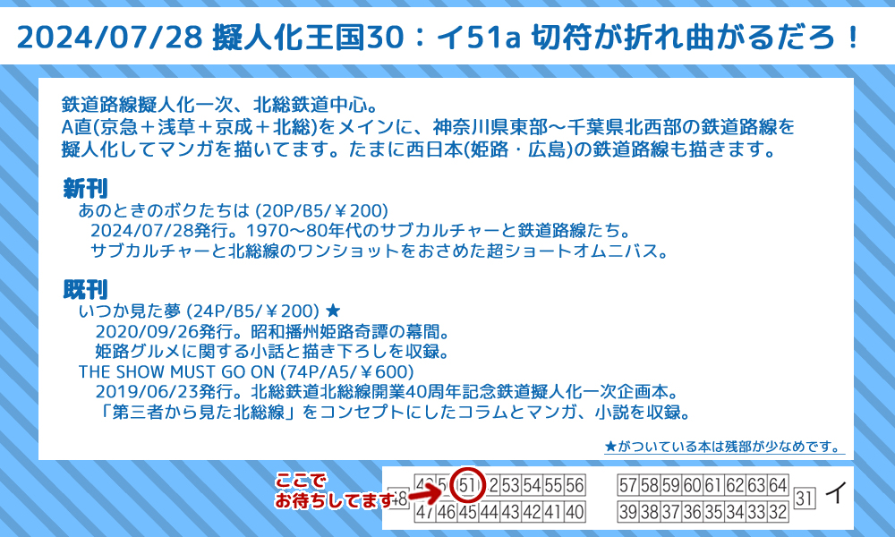 擬人化王国31では新刊を出したかったのですが、時間が足りなかったのと、自分の納得のいくお話になるまでかなり時間がかかったので断念…。でも、新京成電鉄の合併に関わるお話なので、イベント合わせでなくていいので出来れば2025年3月末までには出したいなぁと思っています…が、頑張るぞい。