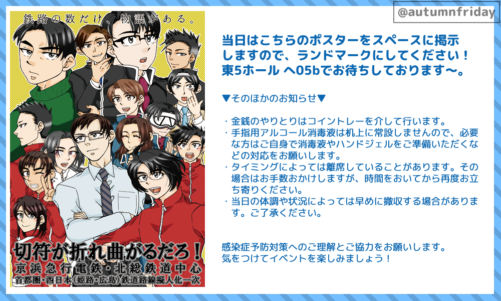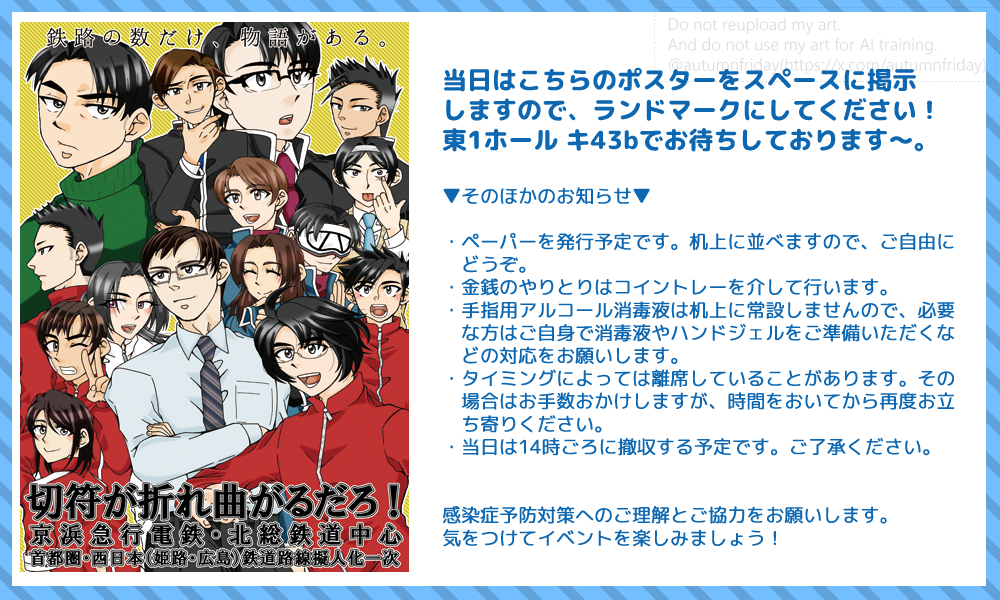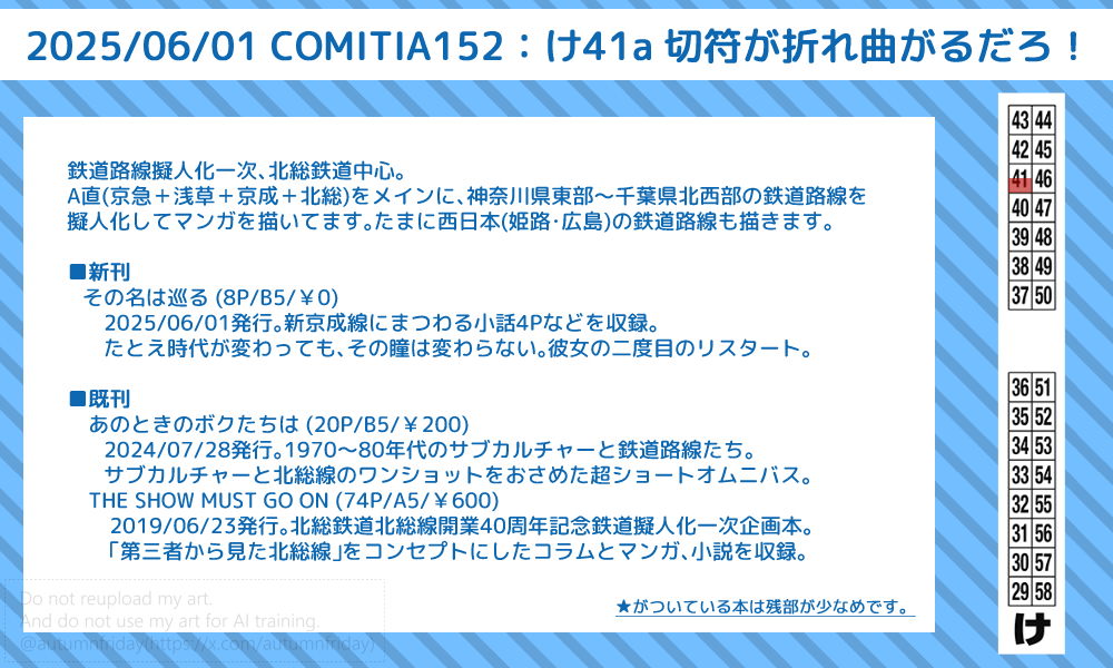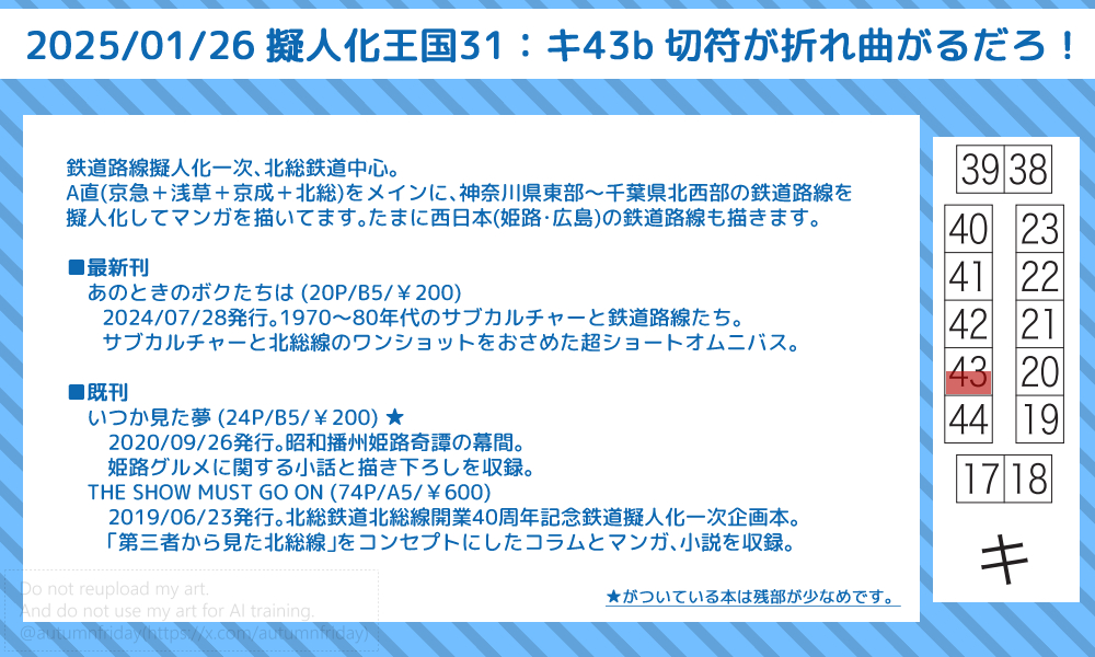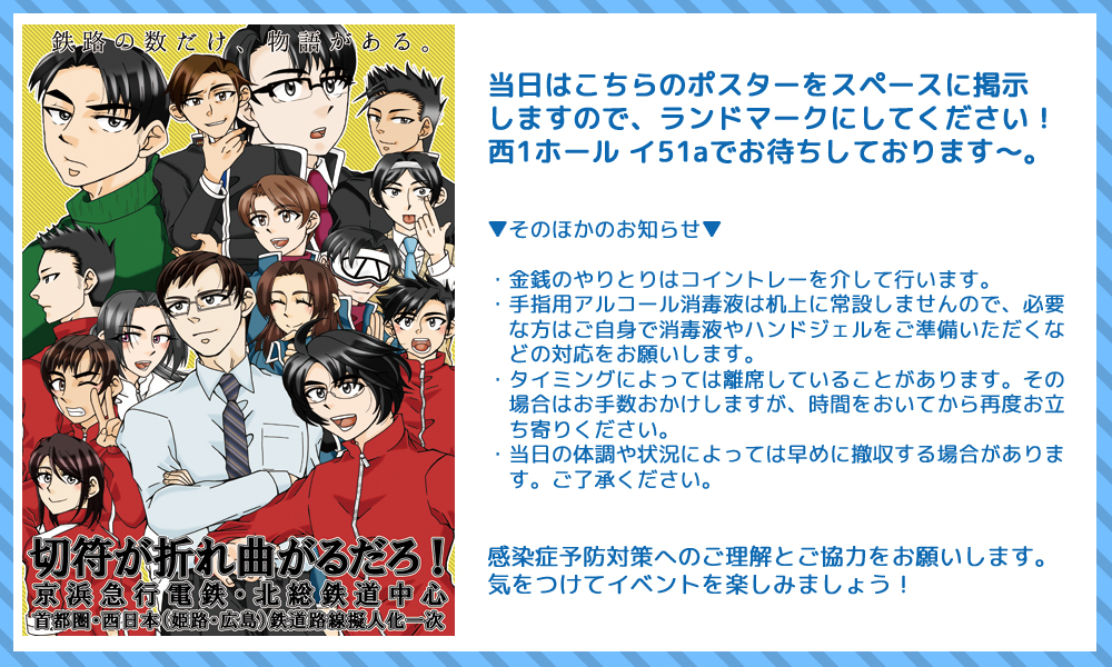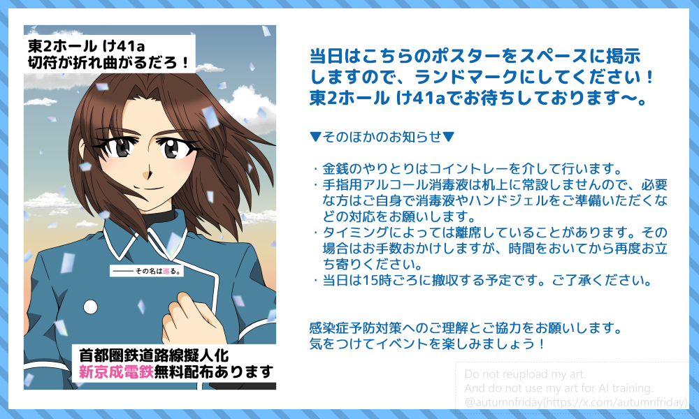 本来であれば新刊を発行する予定だったのですが、やはり時間が足りず、それでも新しい発行物が机上にないのはアレなので、新刊に掲載予定だった新京成線の小話を4P掲載した無料配布冊子を頒布することにしました。毎回イベントに負けてて申し訳ないです…。次回は必ず…!出します!(フラグ)